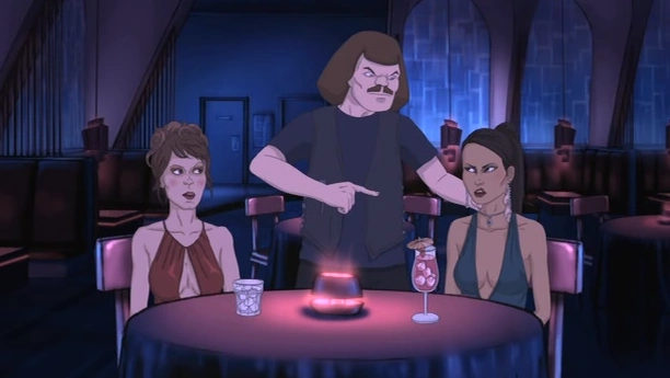 Back in Mordhaus, Rachel is doing well at Scrabble by using the word aquarium. Nathan, visibly bored, says he's going to bed and when Rachel doesn't join him, he mumbles "I'll call you or you call me". The next night Dethklok goes to a bar called The Mastodon and discuss what a sweet person Rachel is, to Nathan's continued annoyance. Murderface spots to women sitting at a table and goes to hit on them, pretending to be protecting him. Toki and Skwisgaar call him on it, pointing out that nobody was bothering them before he came along, Skwisgaar even jokingly asks if Murderface frequents "the doubles douche from road hells" if he thinks bars are unsafe for women. One of the women happily recognizes Skwisgaar and he begins flirting with them. Murderface angrily states that he was first and thus he has claim, but the women derisively dismiss him for being a bass player.