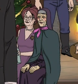 She is a visibly older woman with de-saturated wine-red hair that is kept up in a large hairdo. In all her appearances, she is seen wearing the same purple v-neck dress and pearl necklace. She also wears large glasses, gold earrings, and dress shoes with buckles on them.