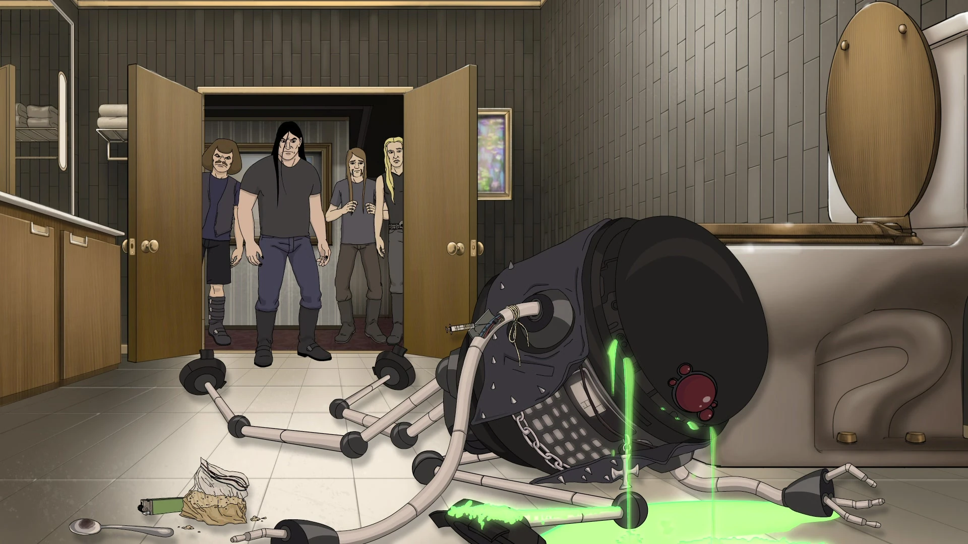 As a result of the X2P-1158's descent into robotic alcoholic madness, Dethklok attempts to tell him that they're relieving him from the band, as they believe him to have become an asshole who's "fucking all their groupies", as stated by Murderface. The X2P-1158 does not take this information well, and retaliates by kidnapping and attempting to kill Dethklok.